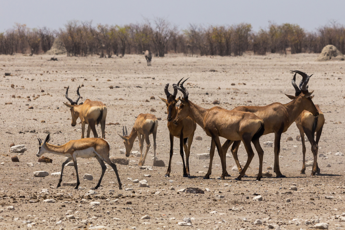 Hartebeest und Springbock am Wasserloch Ozonjuitji m'Bari