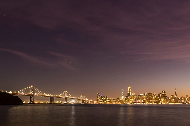 Nächtlicher Blick von Treasure Island auf San Francisco und die Bay Bridge