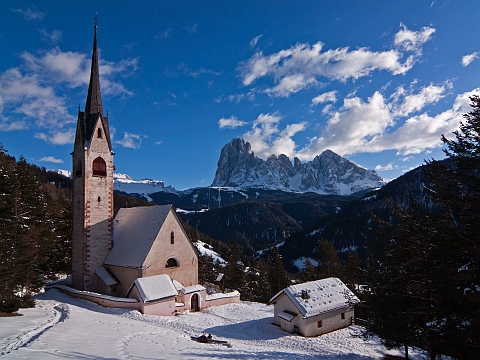 Blick von St. Jakob zum Langkofel und Plattkofel im Grödnertal