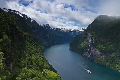 Ausblick auf Skageflå und Seven Sisters am Geirangerfjord