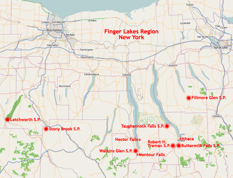 Während meiner Herbst-Tour 2010 verbrachte ich 3 Tage in der wunderschönen Finger Lakes-Region in Upstate New York, wo es viele kleine Schluchten mit unzähligen Wasserfällen zu bestaunen gibt. In dieser Zeit besuchte ich sieben State Parks, wanderte auf schön angelegten Trails entlang kleiner Flüsse durch die Canyons und fotografierte haufenweise Wasserfälle. Die Herbstfarben waren größtenteils auf dem Höhepunkt angekommen, das Wetter spielte meist auch mit, aber merkwürdigerweise waren in den Parks nur sehr wenige Leute anzutreffen. Da die Hauptsaison schon vorbei war, musste ich auch fast nie Eintritt bezahlen und konnte einfach so hinein. Der perfekte Zeitpunkt für meinen Besuch in dieser Gegend! Und ich hätte locker noch einige weitere Tage dort verbringen können - es gibt hier noch so viel mehr schöne Wasserfälle zu sehen! Mal sehen, ob sich irgendwann nochmal eine Gelegenheit ergibt... Die meisten Infos und viele schöne Fotos aus dieser Gegend findet man auf NY Falls, die besten Fotos gibt es bei Joe Braun. |