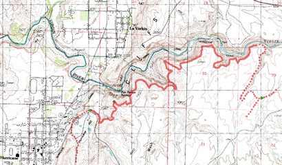 ![]() ![]() Der Trailhead befindet sich nicht weit von Hurricane entfernt am Highway 59. Direkt am Ortsausgang führt die Straße hinauf auf den Hurricane Hill, und oben gibt es einen Parkplatz, links der Straße bei den Sendemasten, der kaum zu verfehlen ist (N 37°10.740' W 113°16.601'). Hier steht eine Infotafel, bei der der Trail beginnt. Man fährt nach links am Zaun entlang, geht durch ein Tor, und schon befindet man sich auf dem Singletrail. Jetzt kann der Spaß beginnen! Am Anfang geht es zwar meist bergauf, doch oben entschädigt die tolle Aussicht vom Panorama Point, wo man den Blick über die beiden Städte Hurricane und La Verkin und die Virgin River Bridge schweifen lassen kann. Die Streckenführung ist einfach super, ein ständiges Auf und Ab auf schmalem Singletrail, teilweise direkt oberhalb des Virgin River Canyon, dann wieder weiter entfernt, wenn man Seitencanyons umfahren muß. Nach etwa 5 Meilen kommt dann der Damm in Sicht. Hier entschied ich mich, wieder umzudrehen. Auf dem Rückweg sind es etwas weniger Höhenmeter und man kommt schneller voran, besonders das letzte Stück macht hier Spaß, wenn man wieder in Richtung Parkplatz hinab fährt. Schade, daß es diesmal nicht für die ganze Runde gereicht hat. Wenn die anderen Trails ähnlich ausgelegt sind, dürfte das eine spaßige Tour sein, landschaftlich zwar nicht der absolute Hit, aber dafür fahrerisch vom Feinsten! |