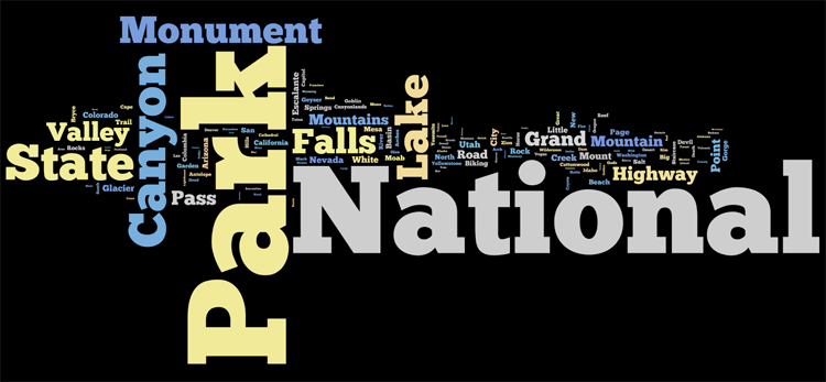 Word Cloud erzeugt, und zwar aus allen Parks, Staaten, Städten und sonstigen Zielen, die ich