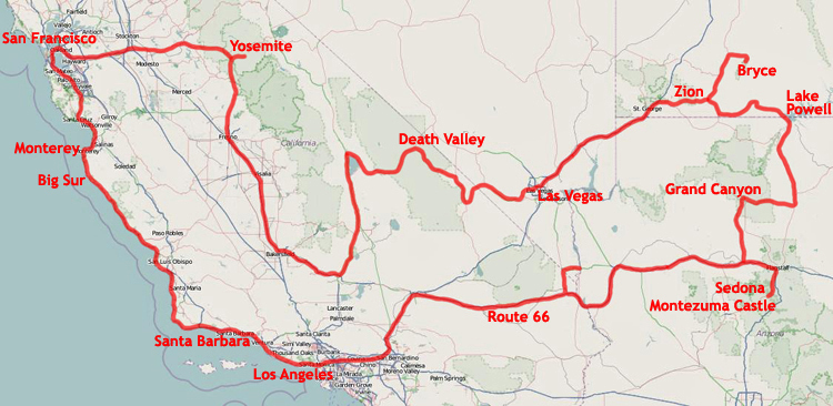 San Francisco, Monterey, Big Sur, Highway No.1, Santa Barbara, Los Angeles, Universal Studios, Calico Ghost Town, Route 66,