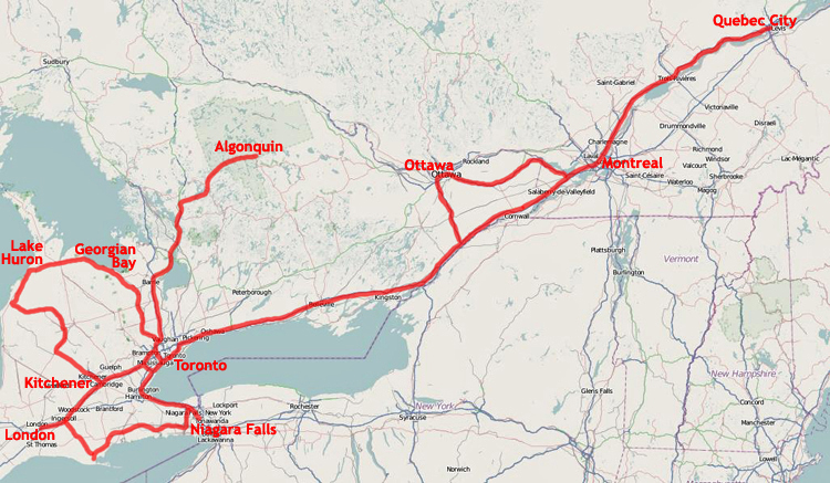 Toronto, London, Kitchener, Niagara Falls, Algonquin P.P., Lake Ontario, Lake Erie, Lake Huron, Georgian Bay, Montreal, Ottawa, Quebec City