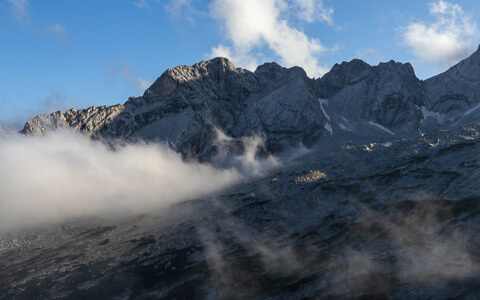 Einige Fotos von unserer zweitägigen Besteigung der Zugspitze mit Übernachtung auf der Knorrhütte. Anfang des Jahres hatten mein bester Freund und ich nach langen Überlegungen endlich beschlossen, uns auf das Abenteuer Zugspitzbesteigung einzulassen und auch gleich zwei der letzten freien Hüttenplätze auf der Knorrhütte im Juli gebucht. Zum Glück erwischten wir zwei Tage mit fantastischem Wetter, und so ging es nach der Anreise Montag früh durch die Partnachklamm und das wunderschöne Reintal hinauf zur Hütte. Am nächsten Morgen wanderten wir weiter zum Zugspitzplatt und von dort über den Steig auf den Gipfel, wo wir nach zwei verhältnismäßig geruhsamen Tagen zurück in die Zivilisation kamen und von hunderten Touristen empfangen wurden. Dann ging es mit Seilbahn und Zahnradbahn wieder runter und zurück nach Garmisch, und gleich wieder auf die Autobahn und zurück nach Hause. Leicht verrückt, aber großartig!