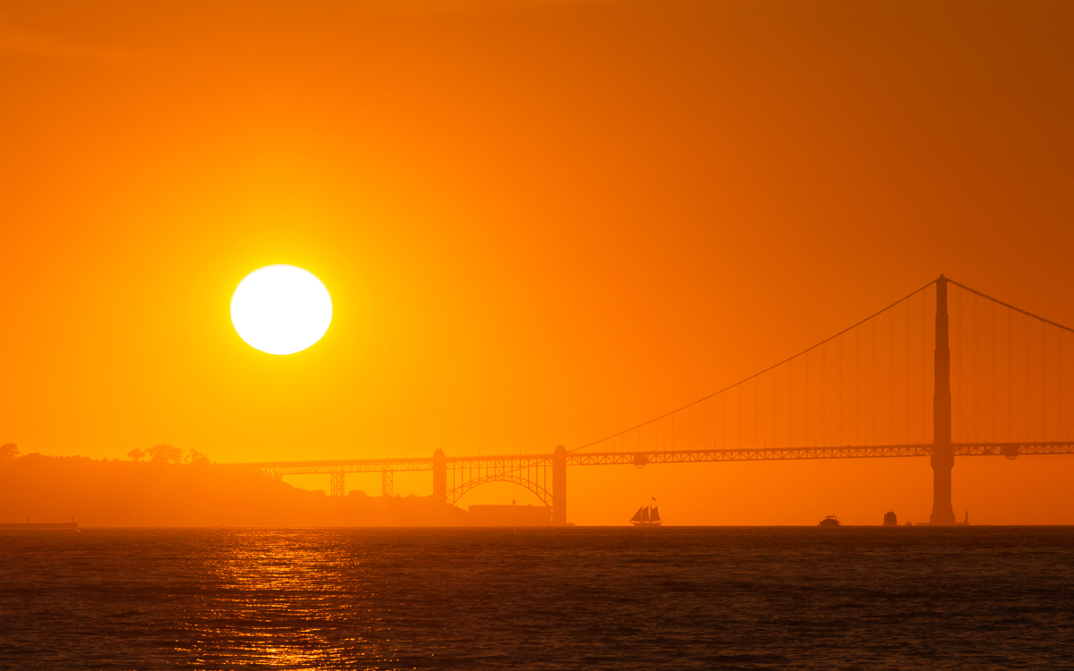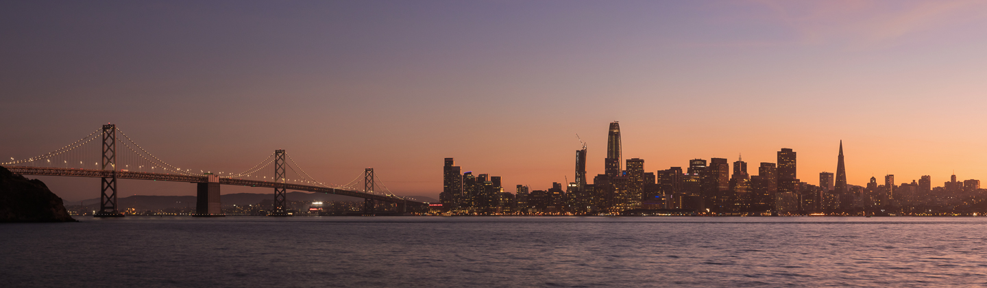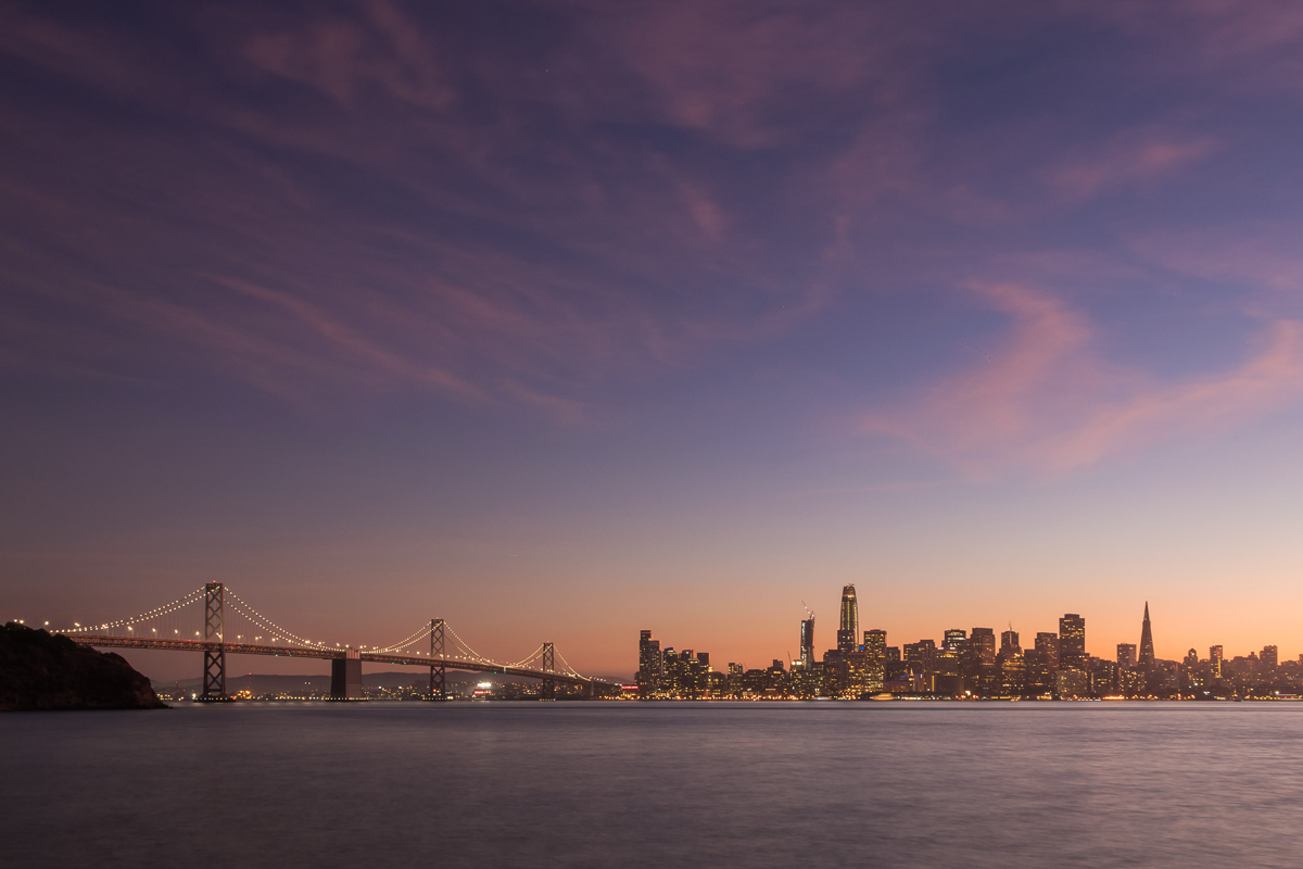 San Francisco und Bay Bridge bei Sonnenuntergang