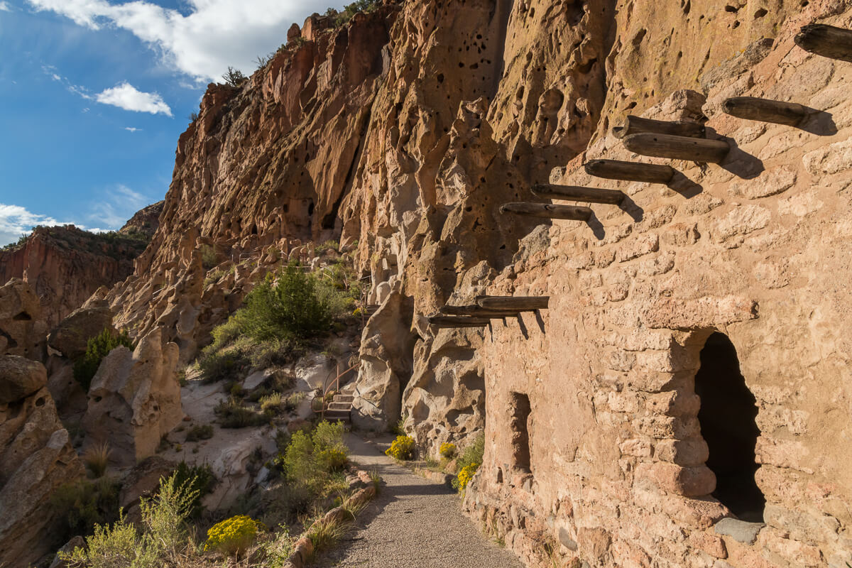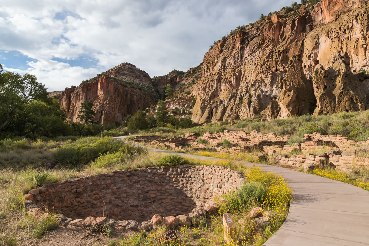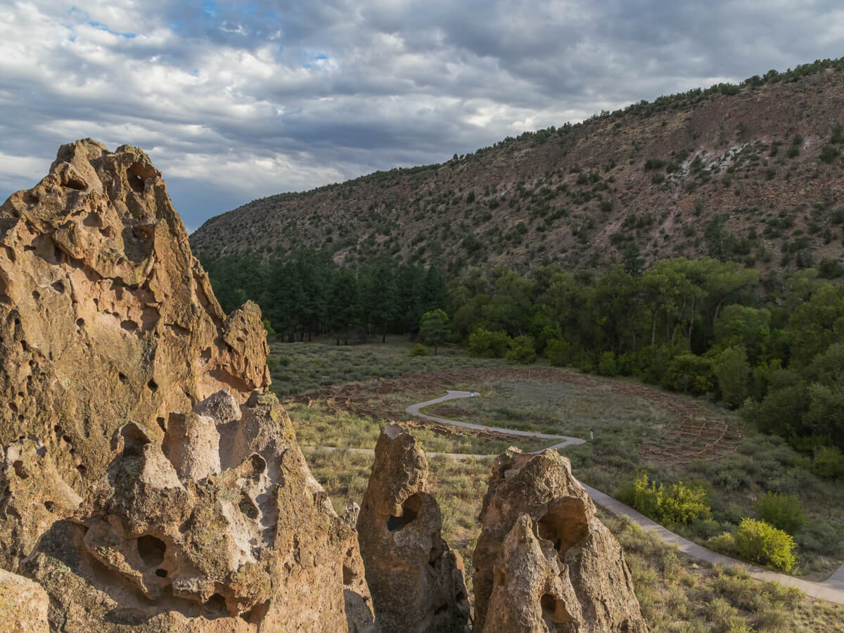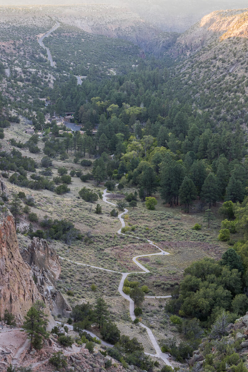 Blick über Frijoles Canyon vom Tyuonyi Overlook
